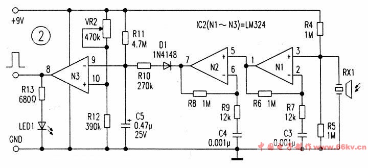該負電平送至由N3組成的比較器反相輸入端,與正相端基準電平比較后,輸出正脈沖。也即將不太規則的反射信號,整形成很規整的觸發脈沖信號,同時LED1點亮。